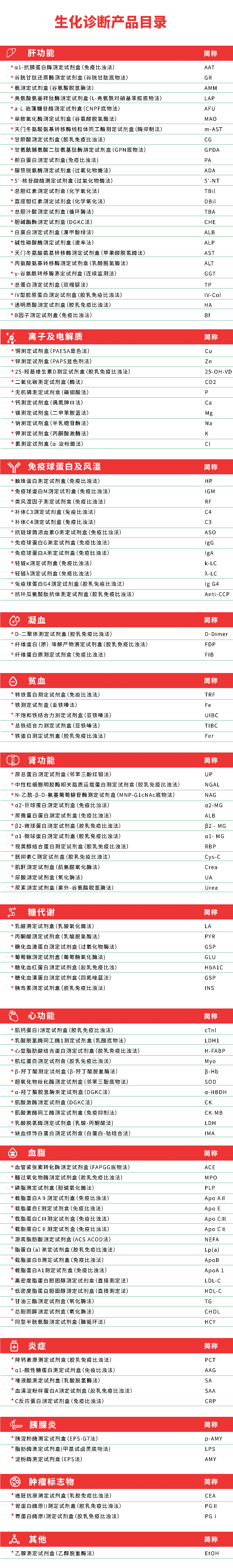 此外,Ezpay基因现在已获证的配套生化试剂涵盖肝功能、肾功能、心功能、离子及电解质、免疫球蛋白及风湿、凝血、贫血等总计114项,试剂性能优越,品类丰富,备货充足。以下是生化诊断试剂产品目录: