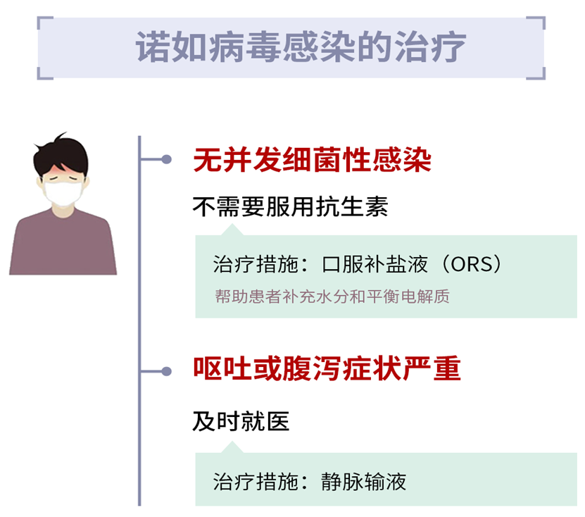 若无并发细菌性感染,诺如病毒感染患者不需要服用抗生素,腹泻和呕吐引起的脱水是最常见的并发症,应及时补充水分以防止脱水;服用口服补液盐(ORS)能帮助患者补充水分和平衡电解质。呕吐或腹泻症状严重时应及时就医。